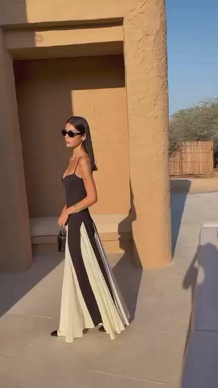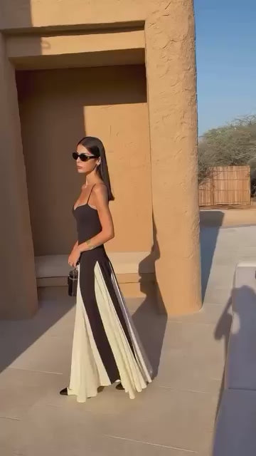 Minimalist şıklığı ve zamansız tasarımıyla öne çıkan bu askılı maxi elbise, siyah ve beyaz kontrastıyla sofistike bir stil sunar. Vücudu saran üst kısmı zarif bir siluet oluştururken, etek kısmındaki beyaz detaylar elbiseye hareket ve özgünlük katar. İnce askıları ve feminen kesimi sayesinde özel günlerinizde, davetlerde veya şık akşam yemeklerinde stilinizi mükemmel şekilde yansıtabilirsiniz.