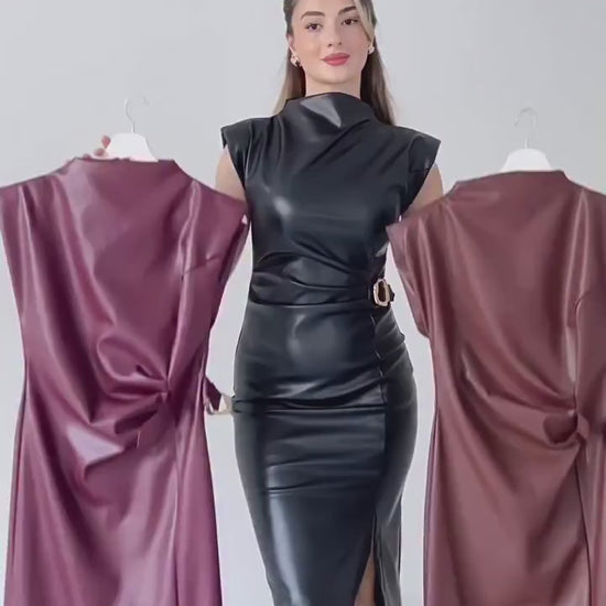 Yumuşak, birinci sınıf suni deriden üretilen bu midi elbise, cesur stili zarif bir feminenlikle birleştiriyor. Yapılı omuzlar ve altın tokalı yan kemer, vücuda şekil verirken, ön yırtmaç hareket ve şehvet katıyor.