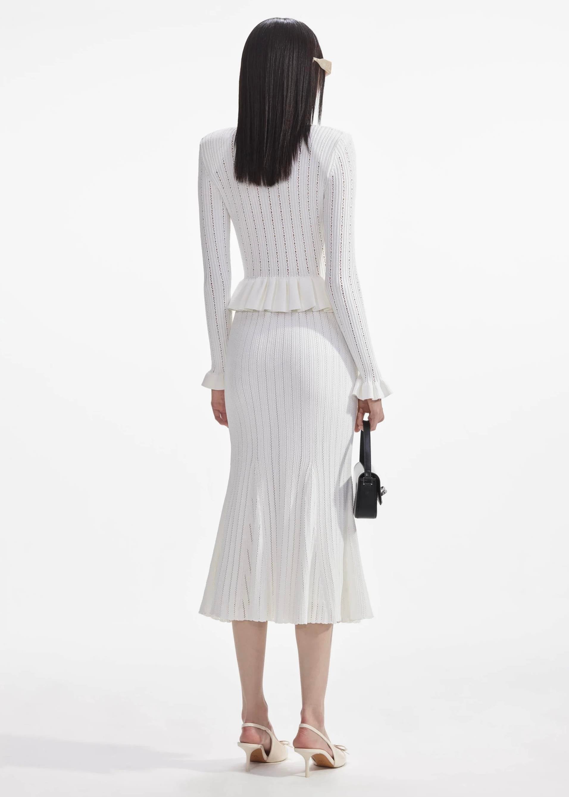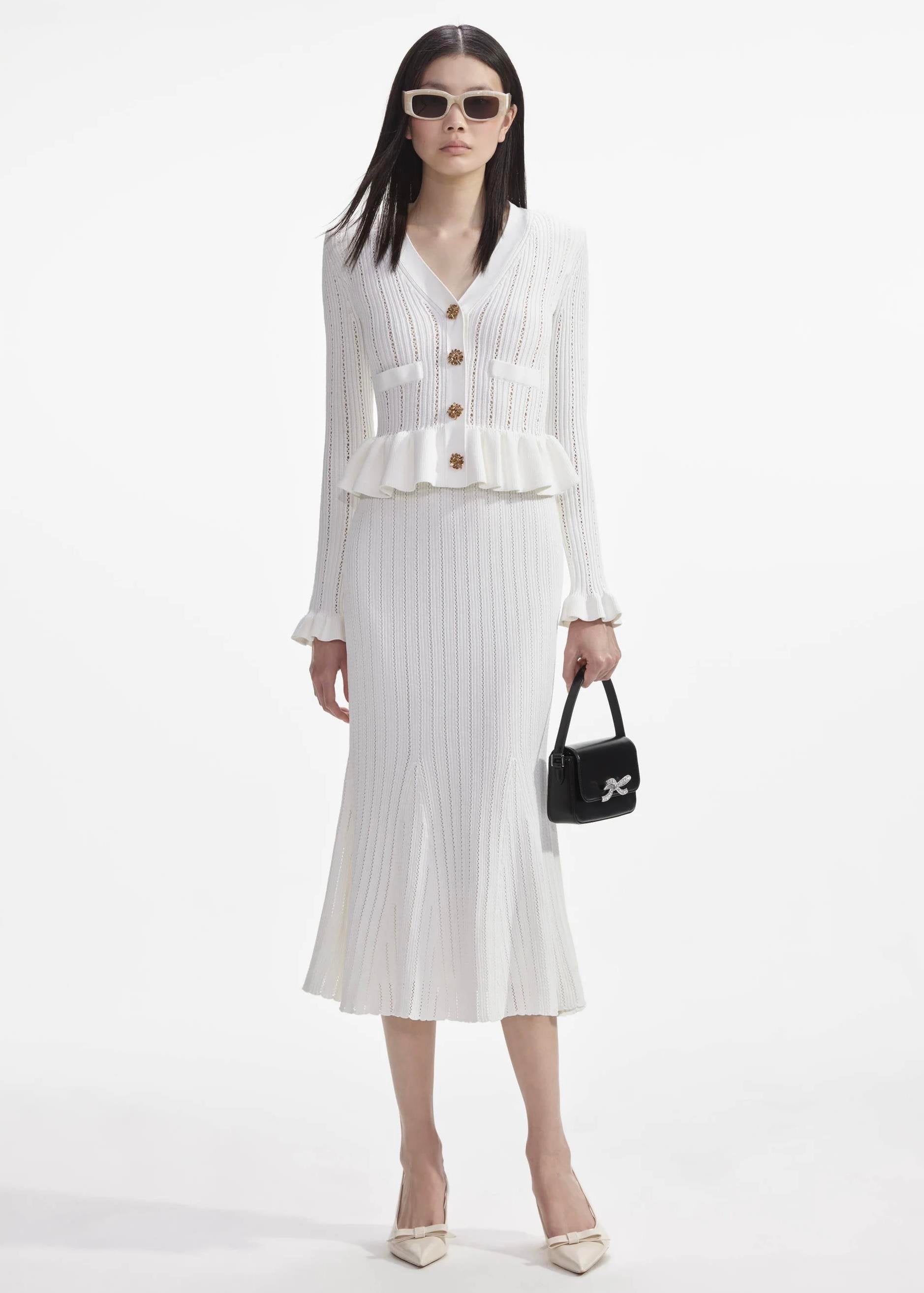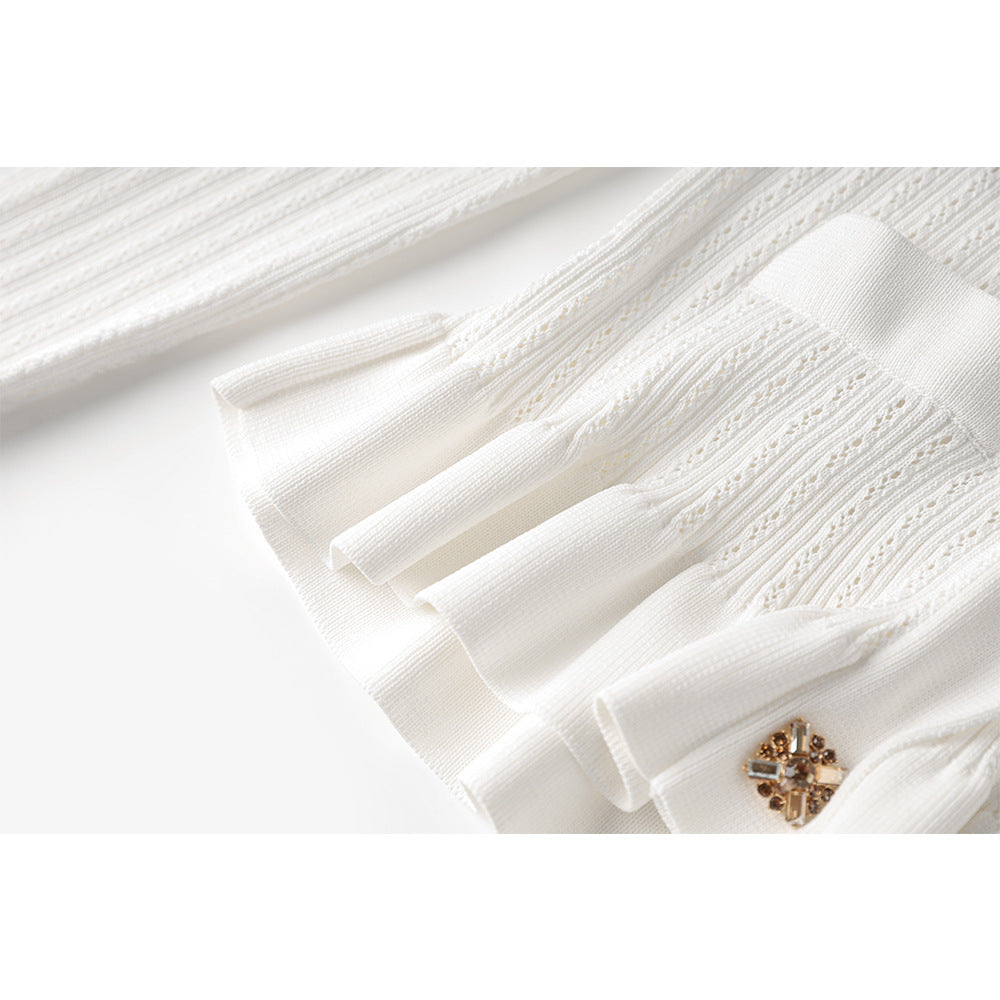 Gold Düğme Detaylı Beyaz Triko Midi Elbise