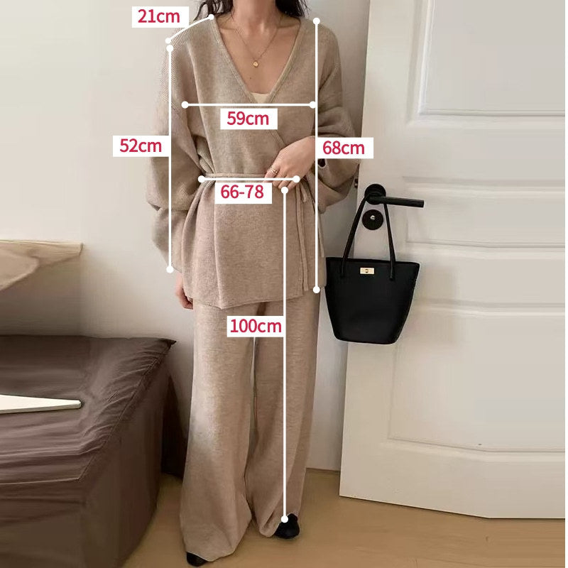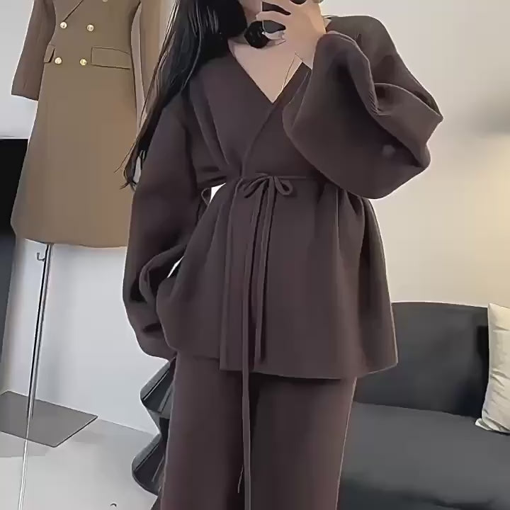 Belissatr™ | Kuşaklı V Yaka Üst ve Geniş Paça Pantolon