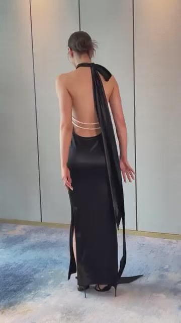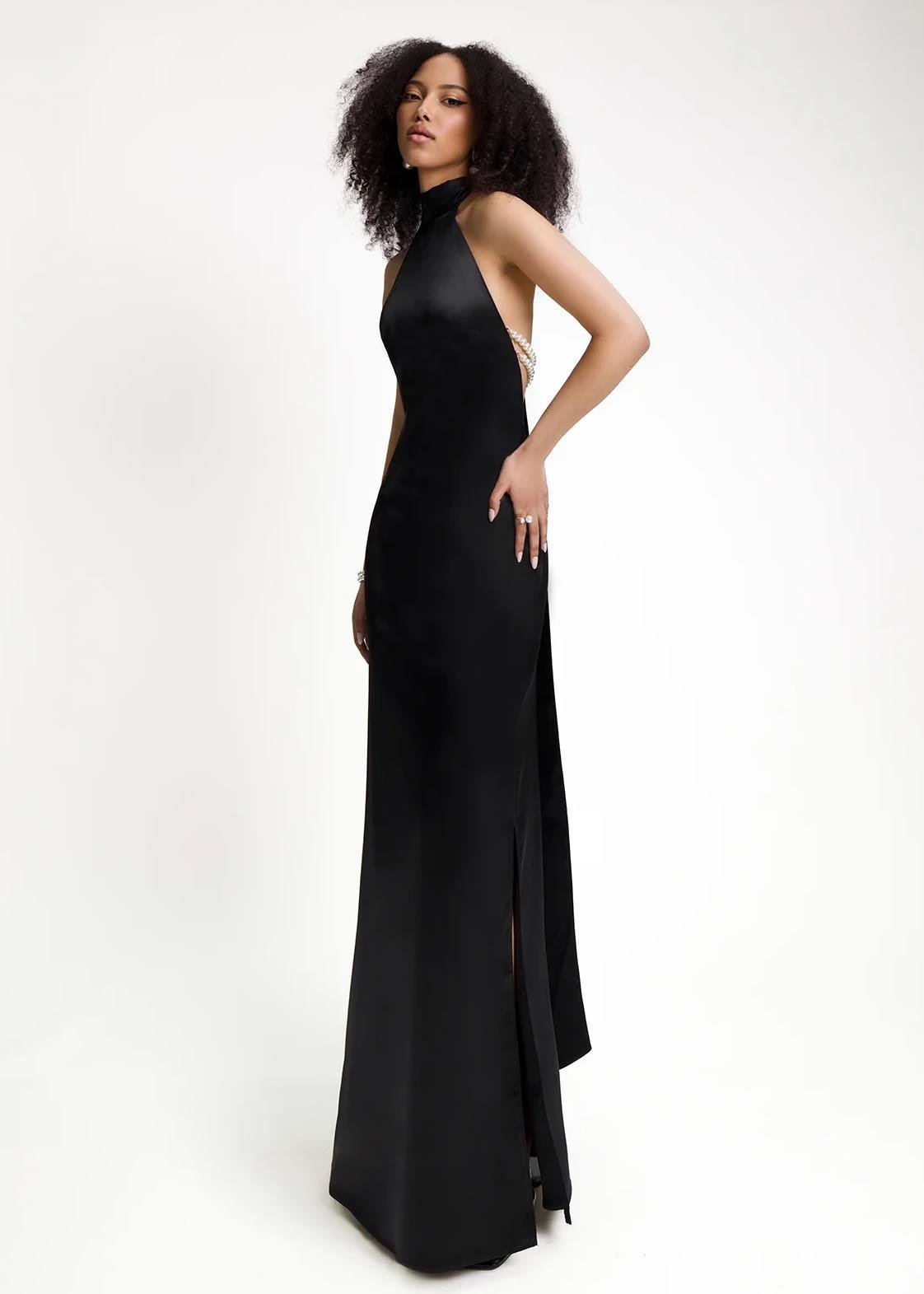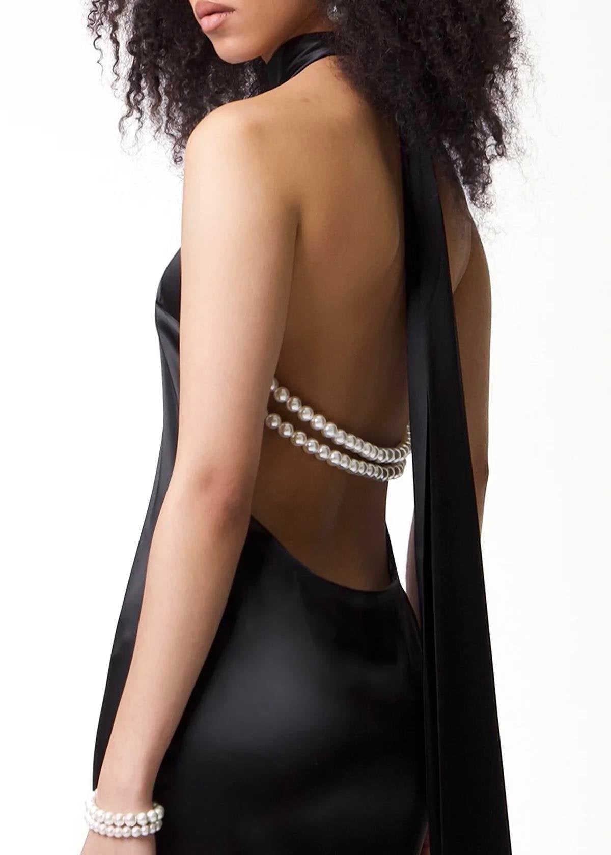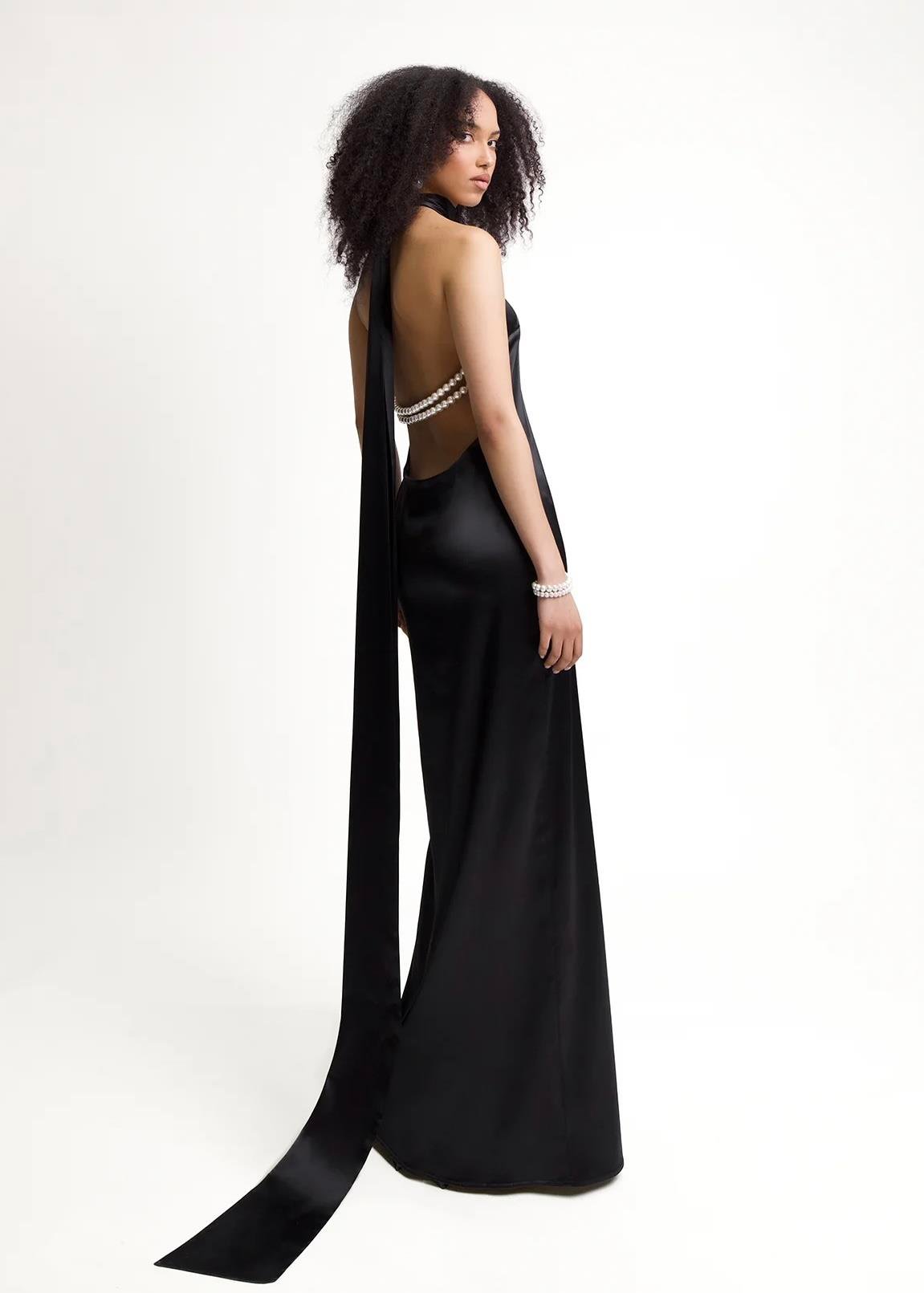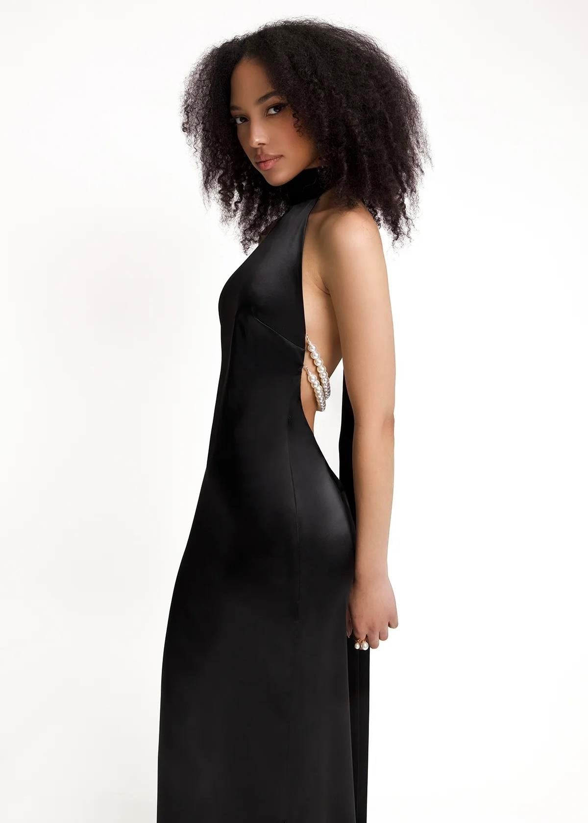 Sırtı İnci Detaylı Siyah Saten Maksi Elbise