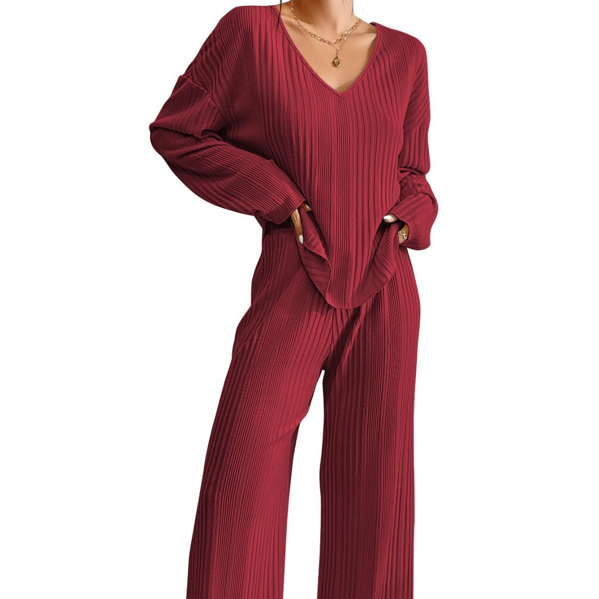 Belissatr™ | Sonbahar & Kış Kadın Ev Giyim Seti – Uzun Kollu Nervürlü İki Parça Pijama Takımı