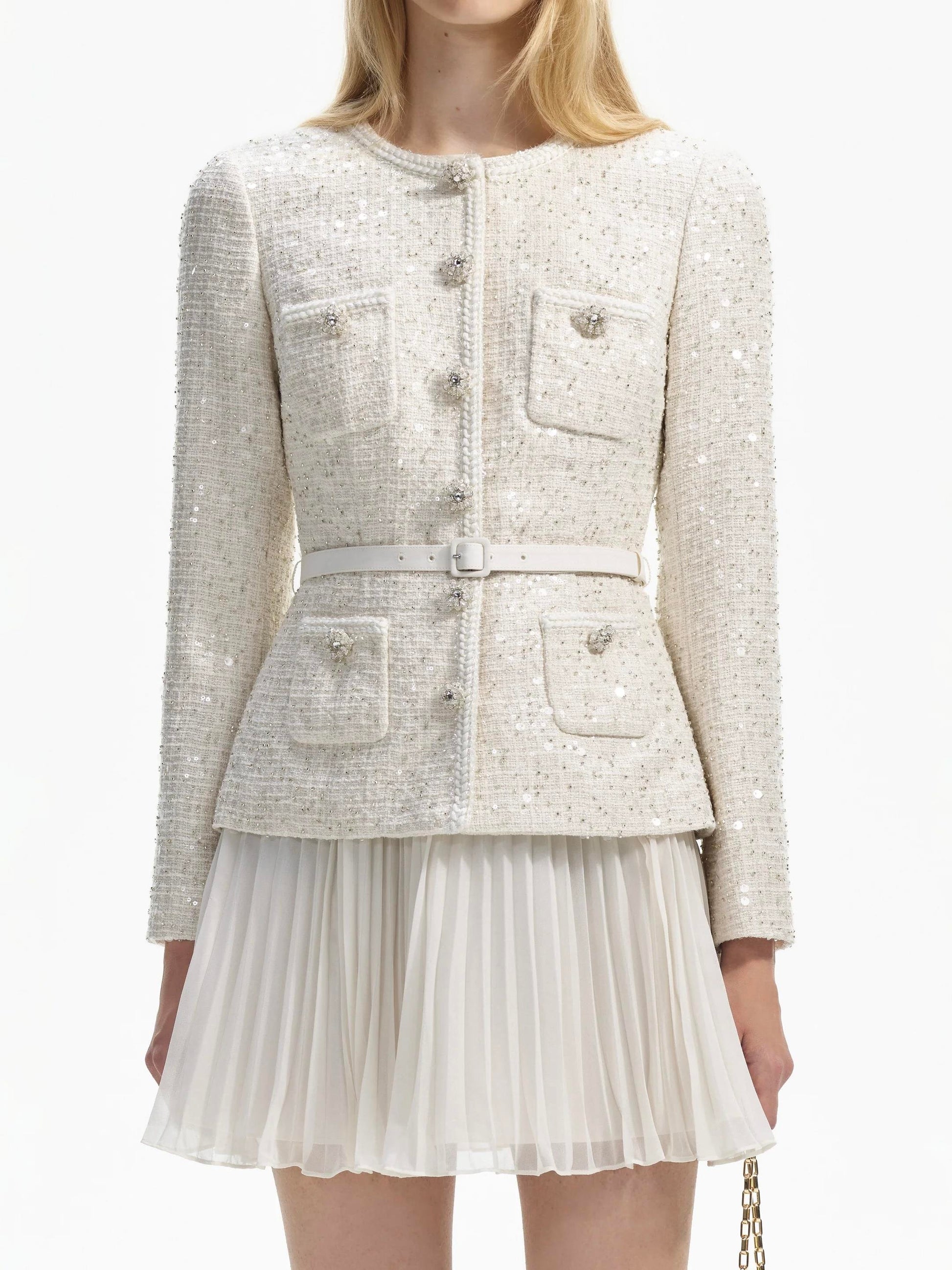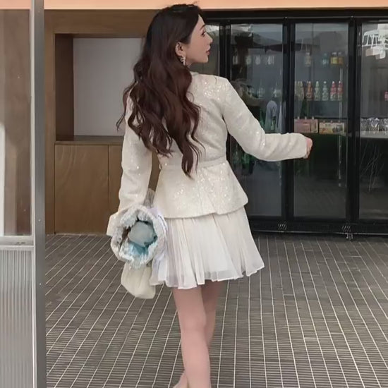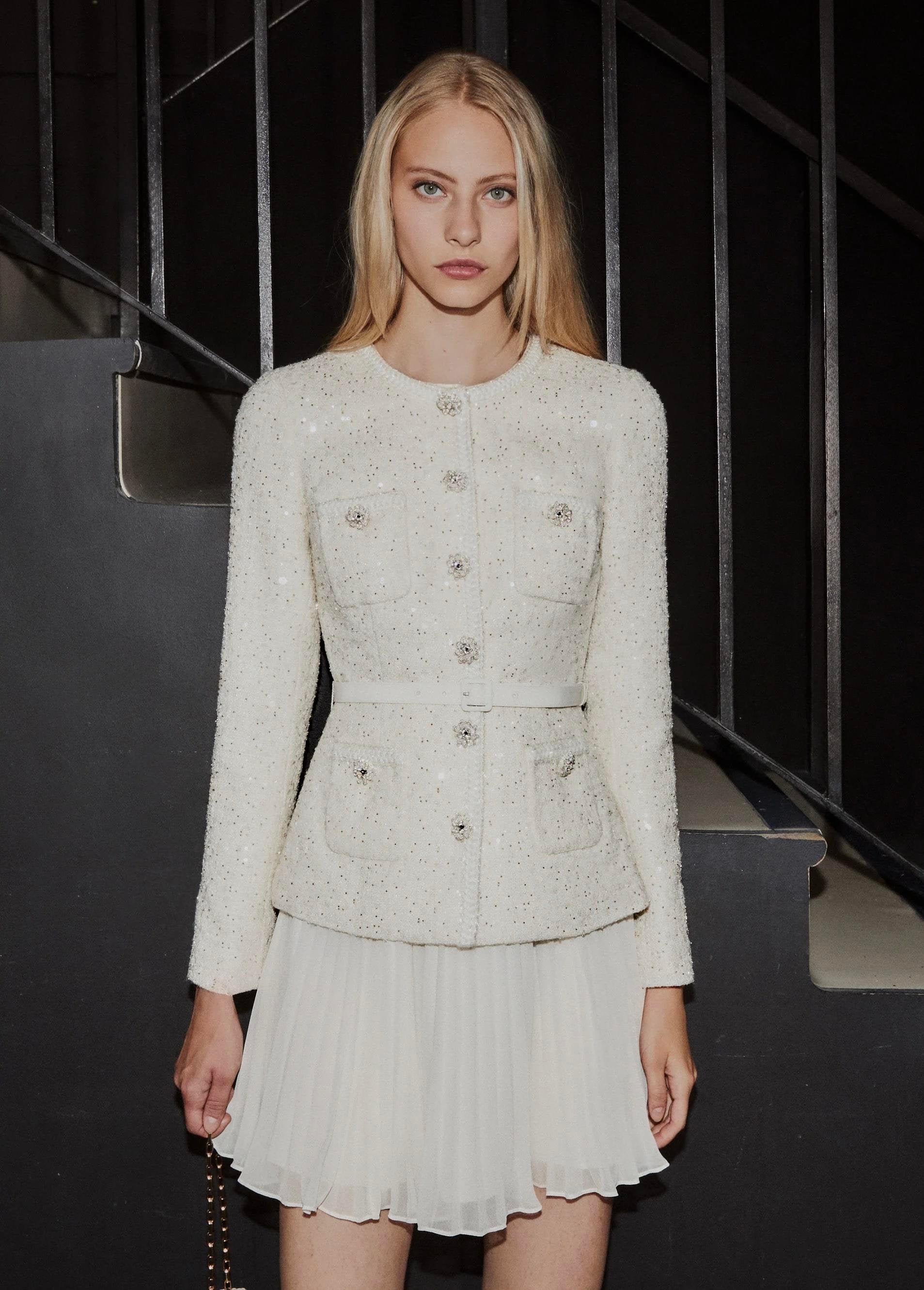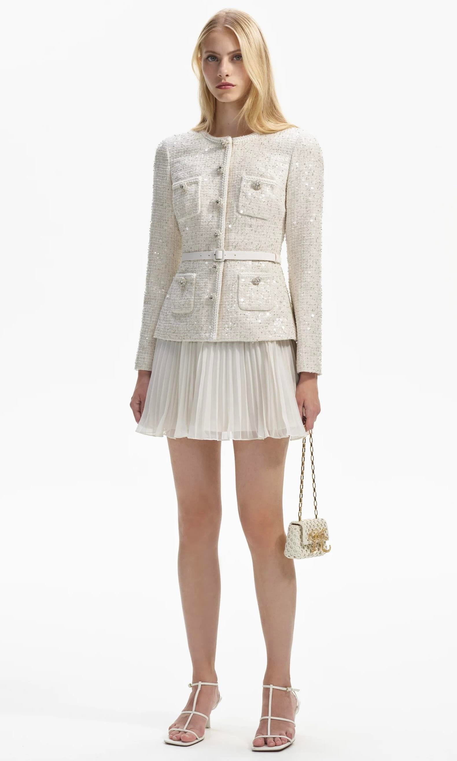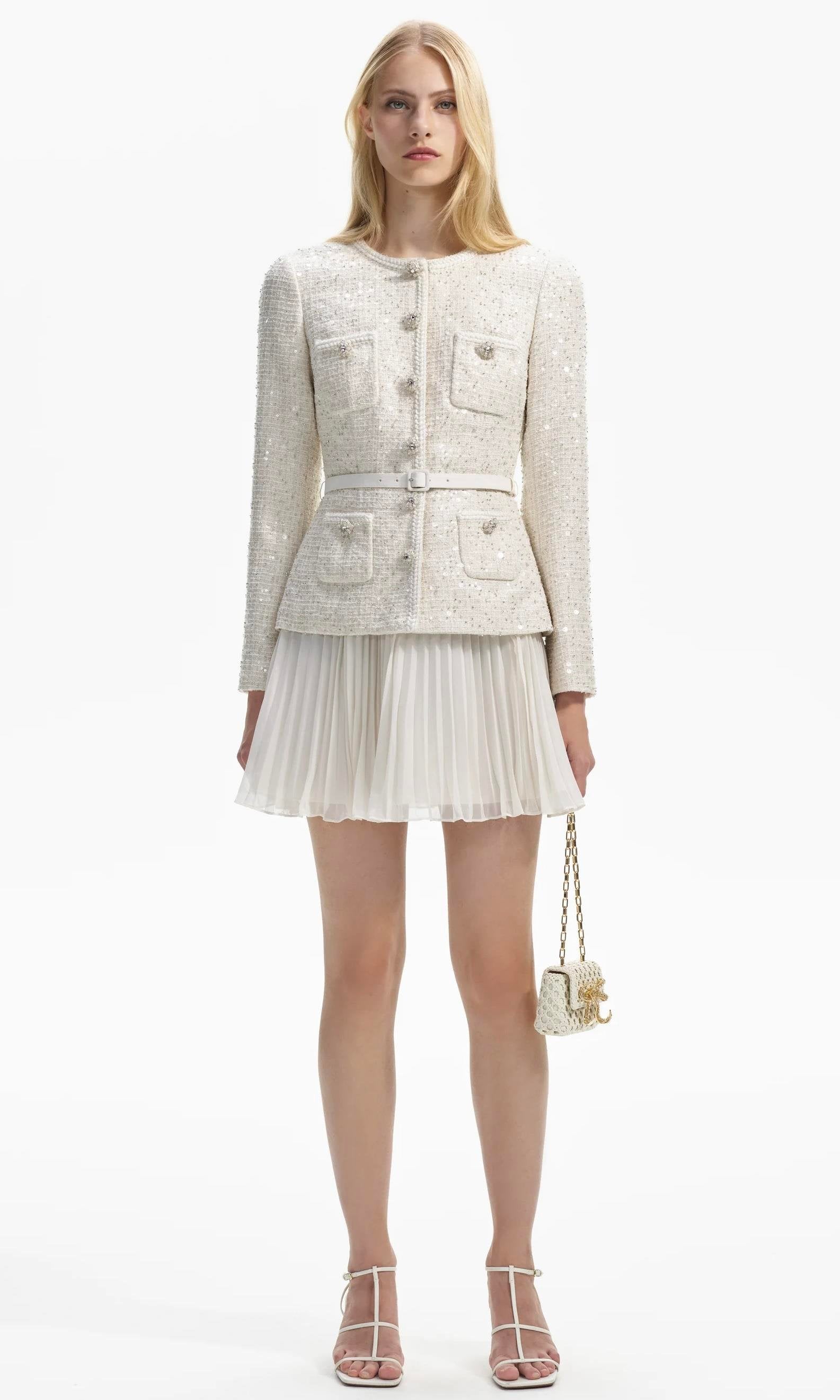 Şıklığı ve zarafeti bir arada sunan bu tüvit ceketli pileli beyaz mini elbise, özel günlerinizde göz kamaştırmanız için tasarlandı.