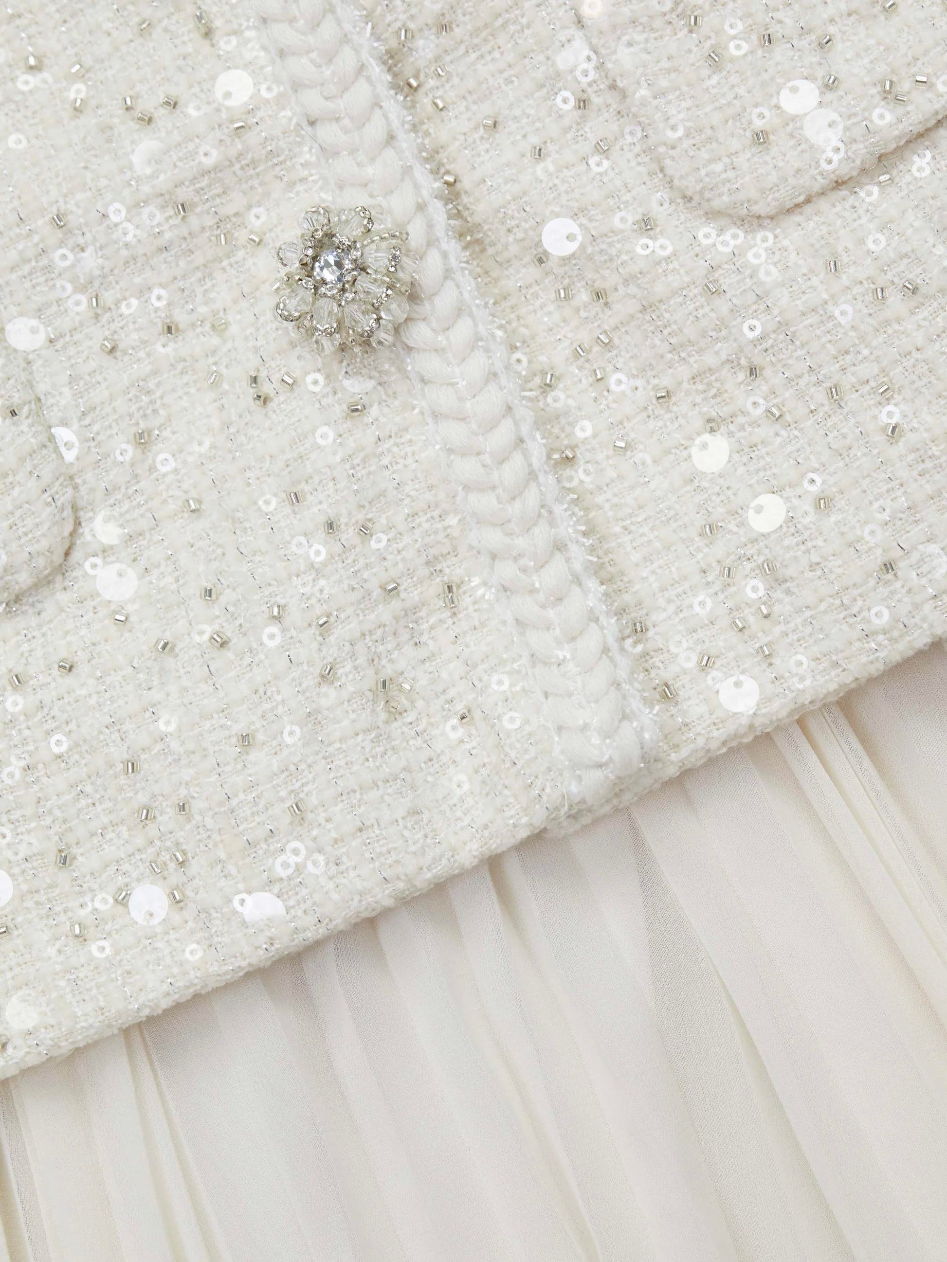 Beyaz tüvit kumaş, zarif parıltılarla harmanlanmıştır. Astarlı yapısıyla konforlu bir kullanım sağlar. -