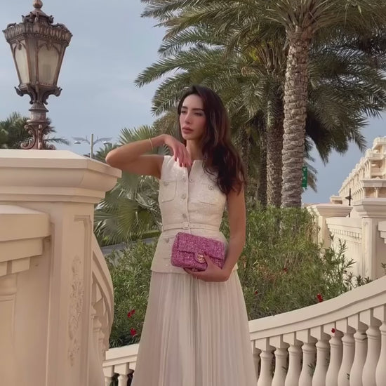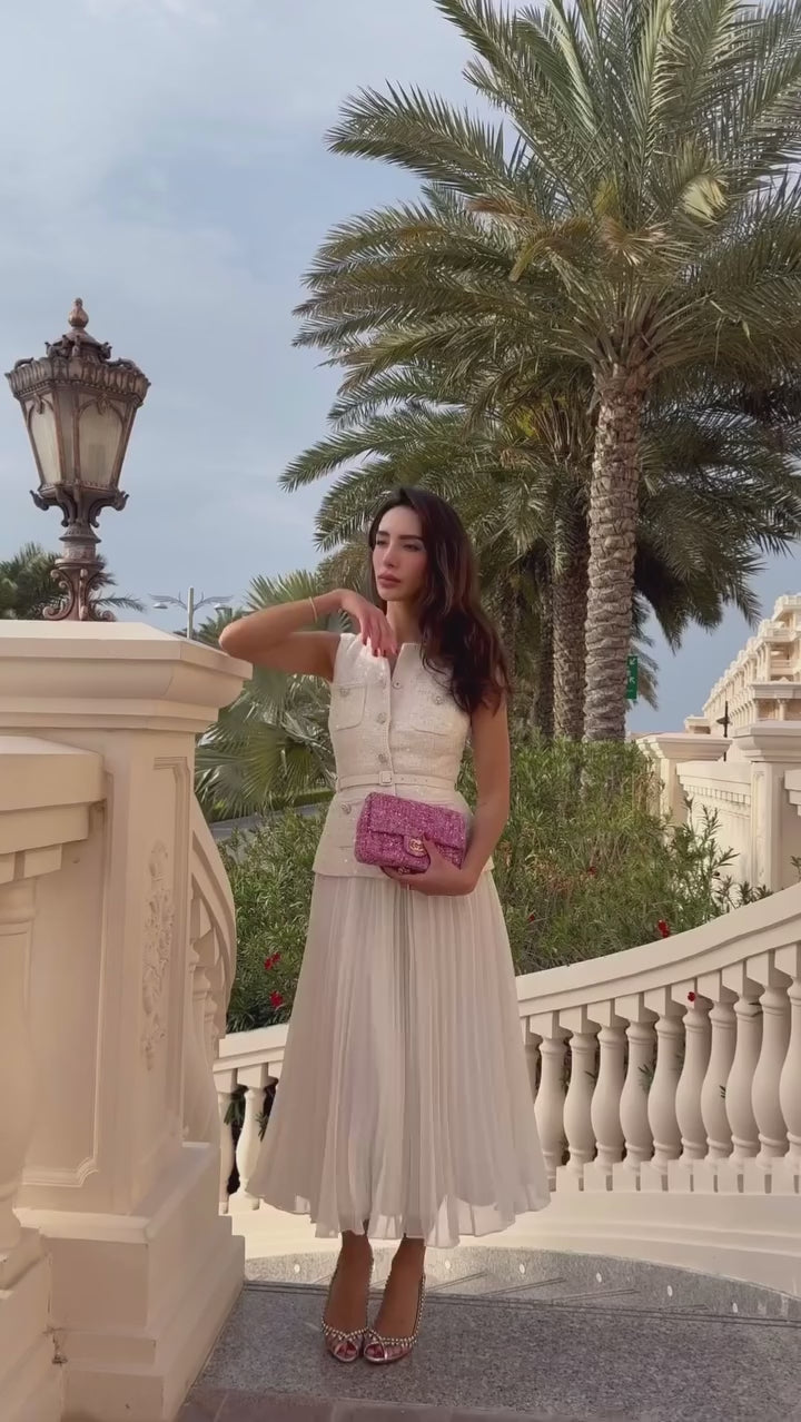 Şıklığı ve zarafeti bir araya getiren Tüvit Yelek ve Pileli Etek Takım, özel davetlerden günlük kombinlere kadar her ortamda öne çıkan bir tasarım sunar. Taş ve payet işlemeli tüvit kumaşıyla lüks bir ışıltı yakalarken, pileli midi boy etek hareket özgürlüğü ve feminen bir görünüm sağlar. Beldeki ince kemer, bedeni zarifçe vurgulayarak modern bir siluet oluşturur.