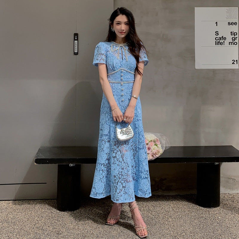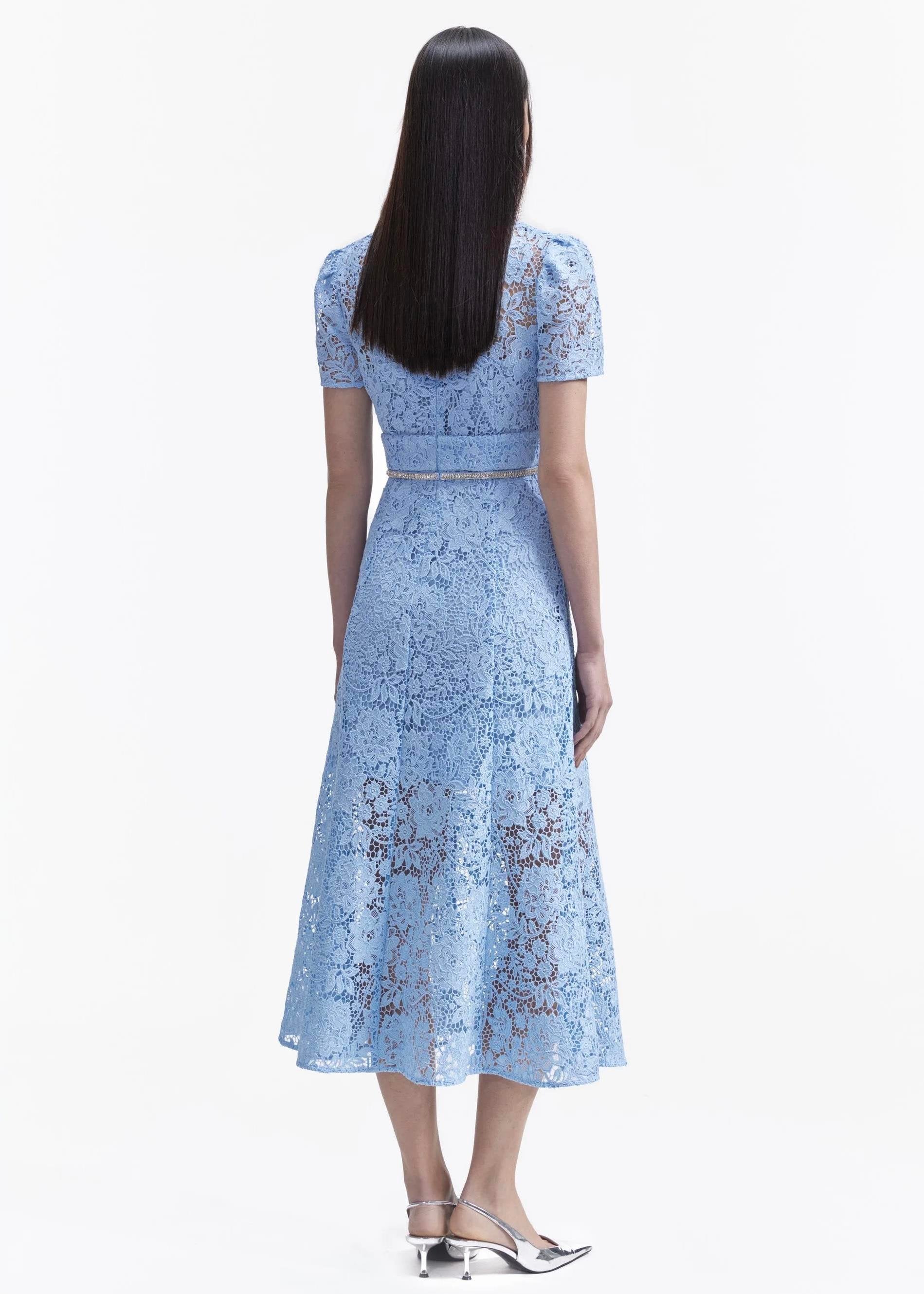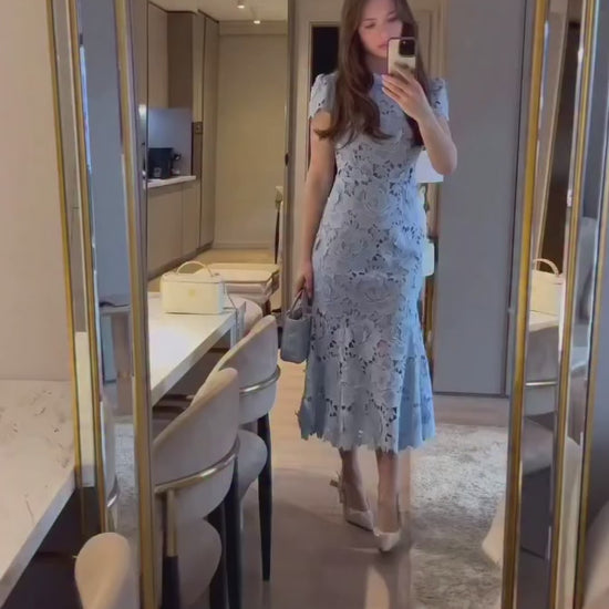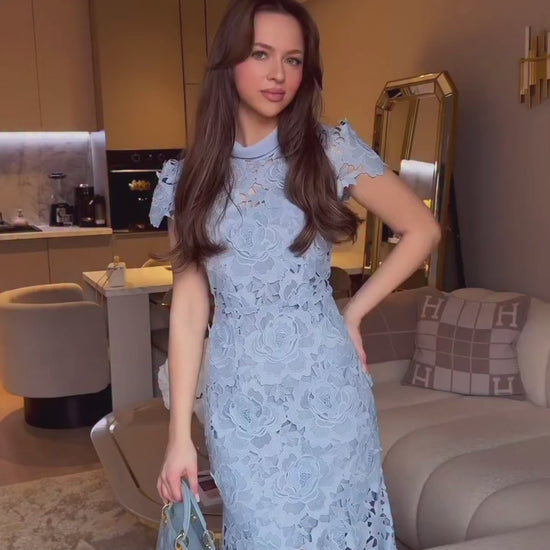 Üç Boyutlu Çiçek Detaylı Mavi- Beyaz Dantel Midi Elbise