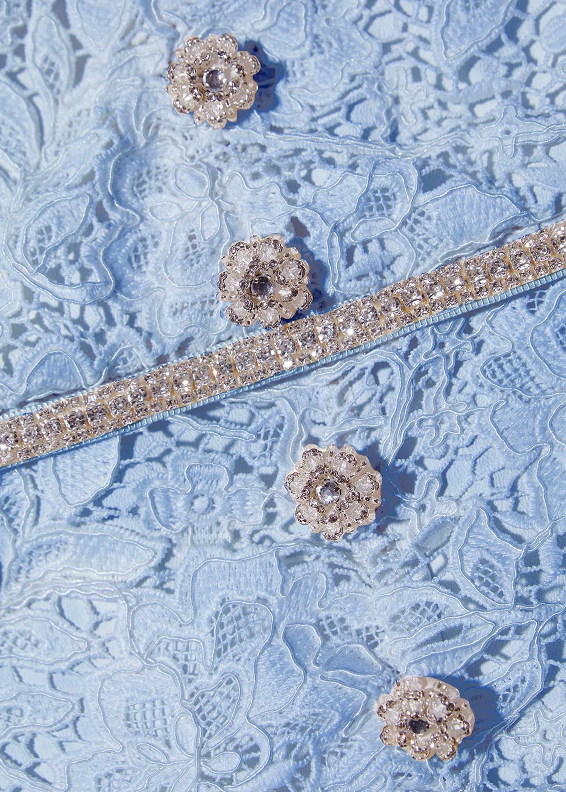 Zarafetin en sofistike haliyle buluştuğu bu elbise, romantik ve feminen detaylarıyla öne çıkıyor. İnce işçilikle hazırlanmış çiçek desenli dantel kumaş, transparan dokusuyla zarif bir görünüm sunuyor. Göğüs kısmındaki fiyonk ve kristal taş işlemeli şerit detaylar, elbiseye ışıltılı bir dokunuş katıyor.